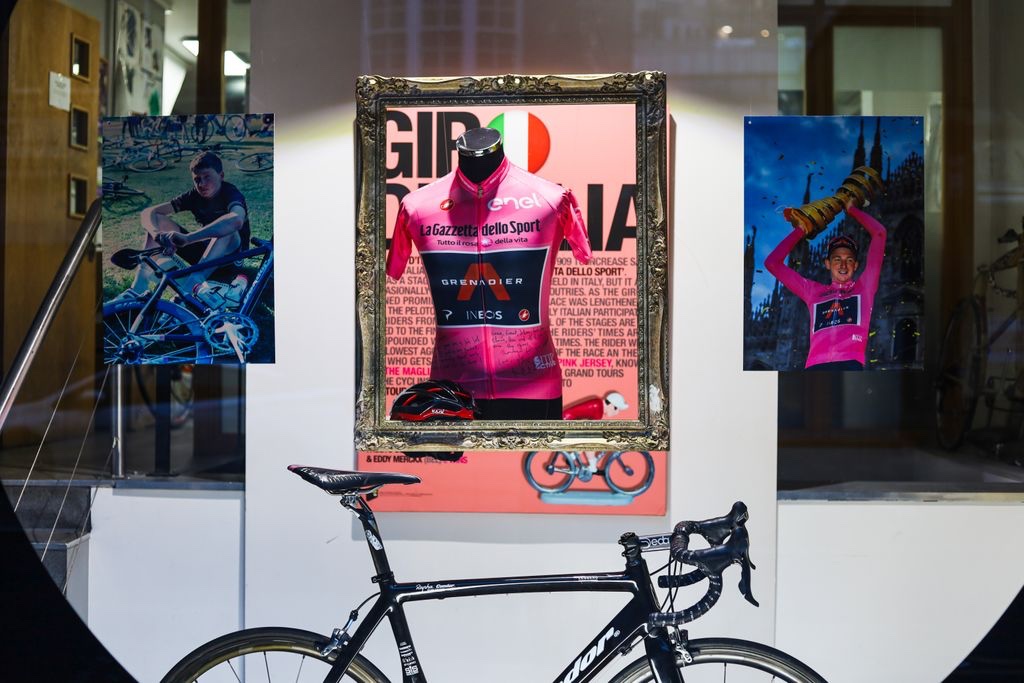 The shop has now made a heartwarming window display honoring Geoghegan Hart that features one of his pink jerseys, a Condor bike, and photos of the Ineos Grenadier rider.